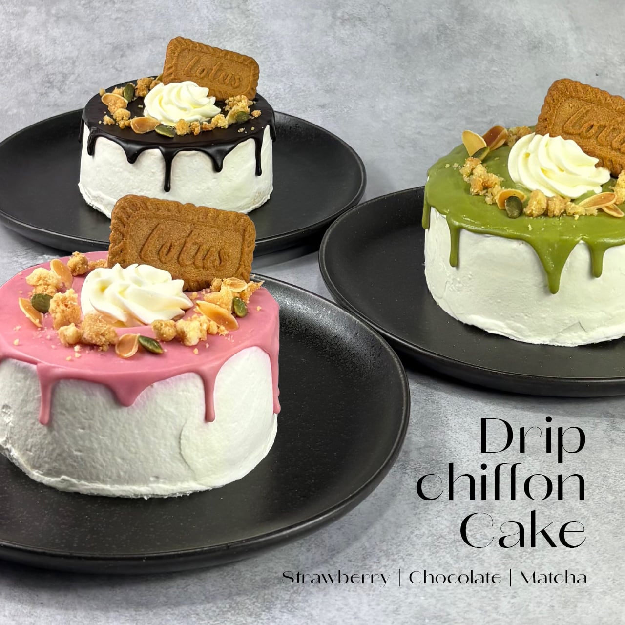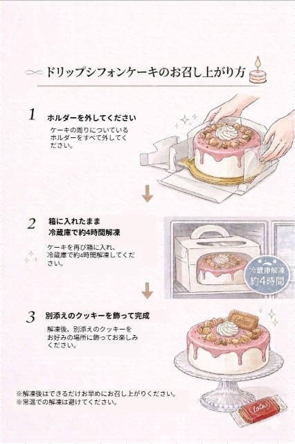 ふわふわのシフォンケーキで作られた、見た目も華やかなドリップケーキが登場!3色からお選びいただけるこのケーキは、ご褒美や手土産、プレゼントとして喜ばれること間違いなし。しっとりとしたケーキが口の中で舞い上がり、贅沢な美味しさをご堪能いただけます。華やかなデコレーションと優しい甘さが特別な瞬間を演出しますので、ぜひ特別な日のお供にどうぞ。